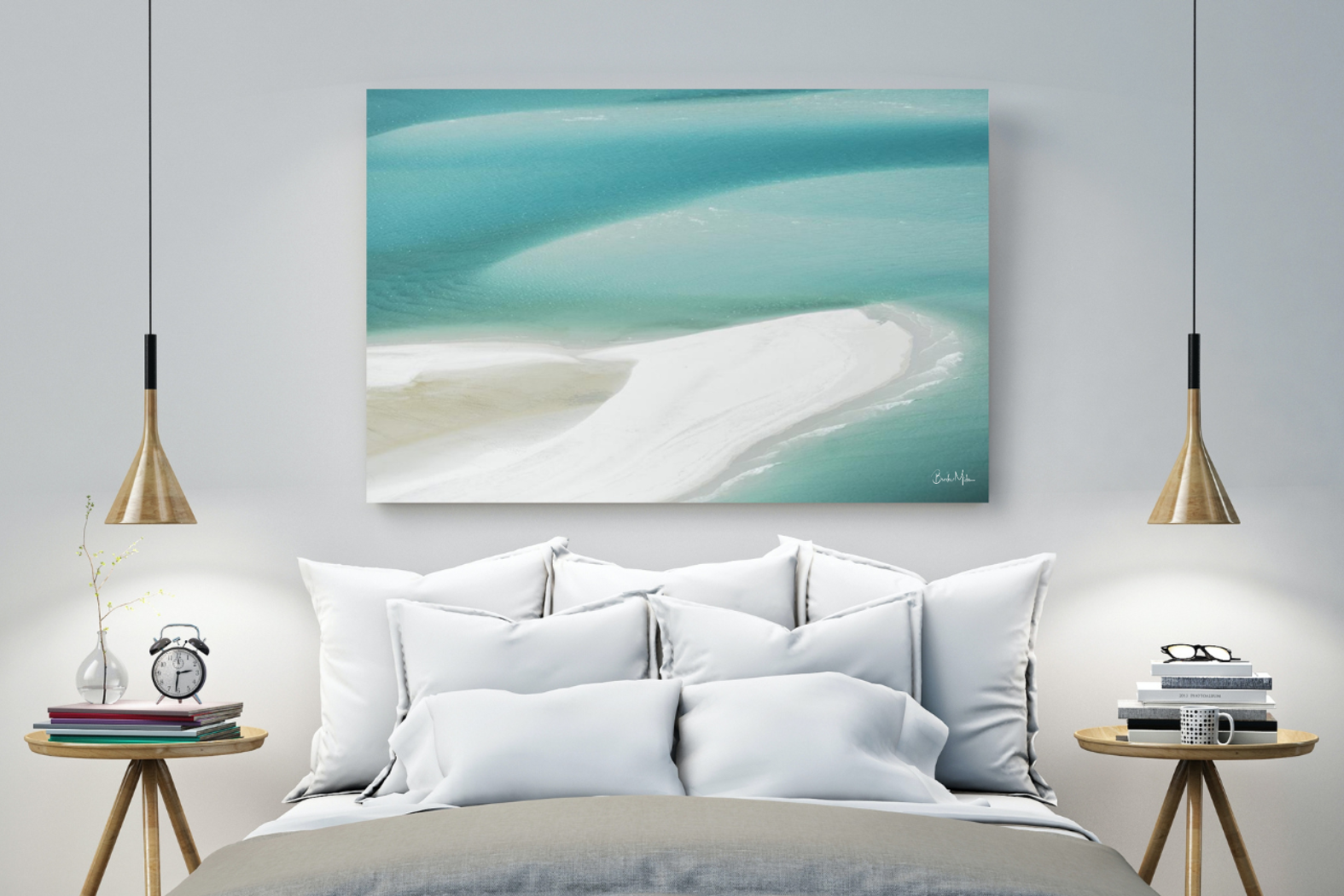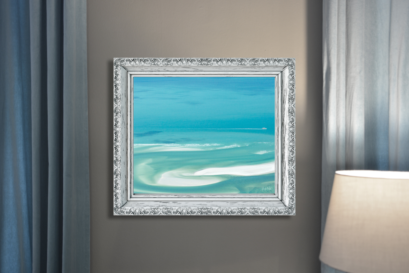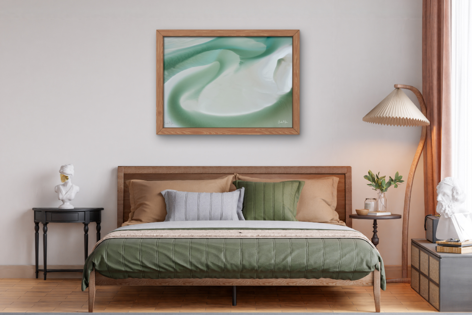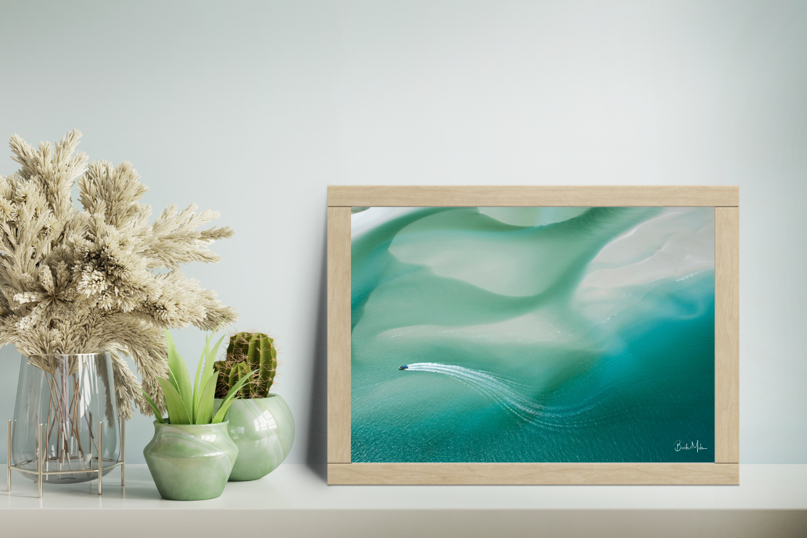 Each print is unique, blending a mix of rhythmic motion, tranquil blues and vibrant patterns, these abstract aerial images invite you to see the ocean as you've never seen it before.