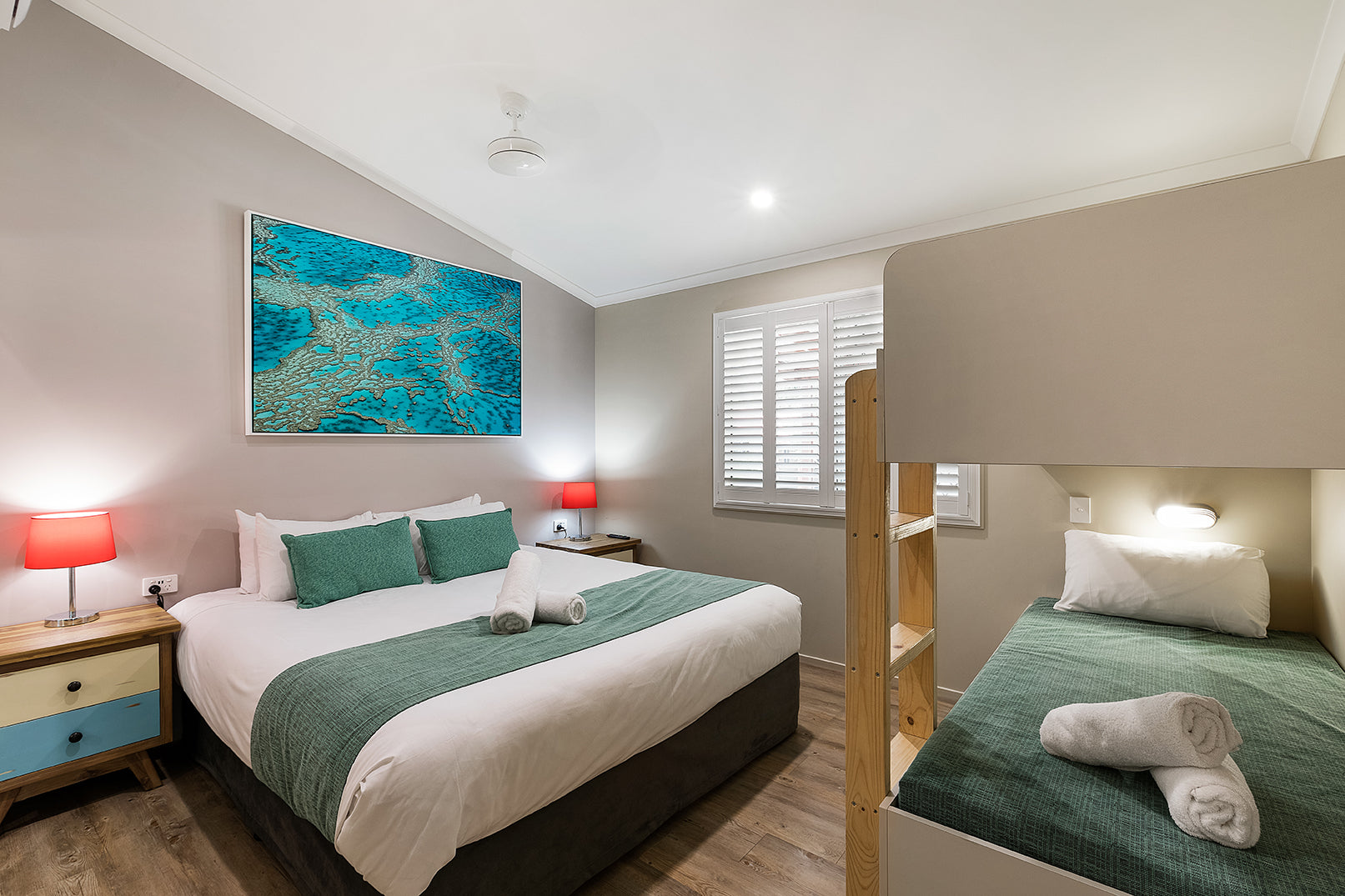 This was a 2 cabin fit-out of large framed canvas pieces ranging from 40in to 80in pieces. We also included a wallpaper feature in the shower fitting using an underwater scuba diver image and rainforest image.