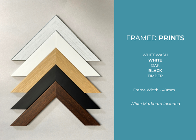You have the flexibility to select your preferred finish and frame from our available options, including Framed Metal, Framed Canvas, Acrylic or Traditional Framed Prints. With frame options available in Black, Chocolate, White, and Oak.