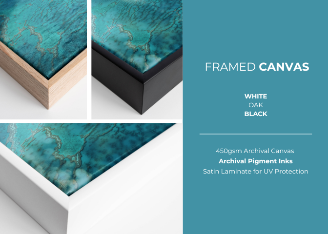 Our canvases come finished in a meranti hardwood timber floating frame wth the choice of white, black or oak colours. These are the choice option when reflections or cleaning might be an issue in your space.