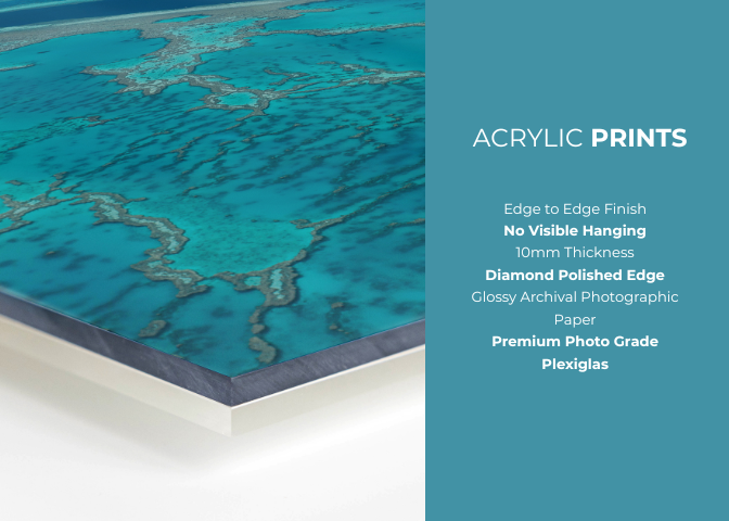Glossy, gallery finish! Our acrylic prints feature ultra-vivid, gloss archival photographic paper, mounted between two 5mm sheets of clear acrylic.