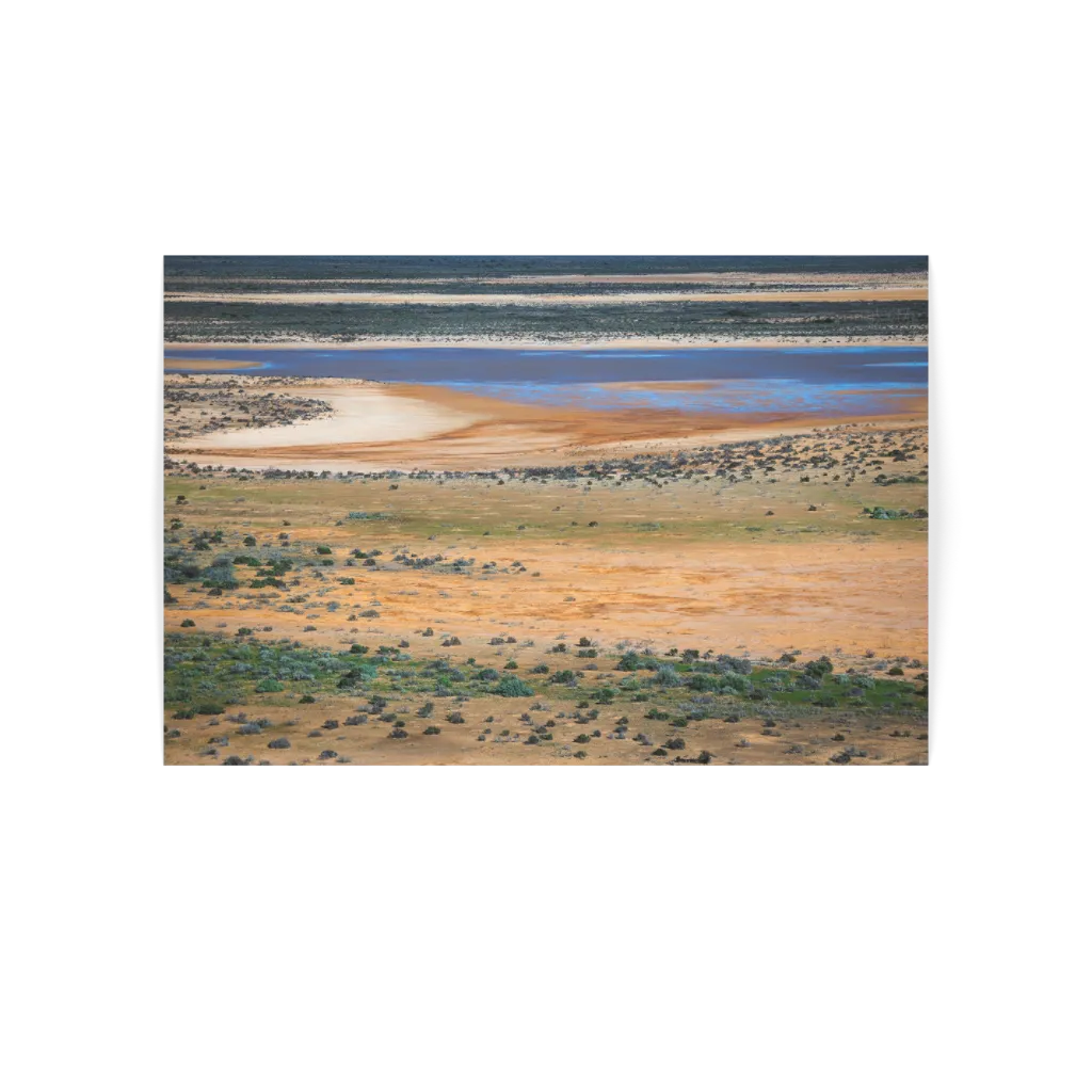 This print showcases the unique colours and open expanses of the Western Australian landscape, where the land meets a serene waterbody under a clear sky.