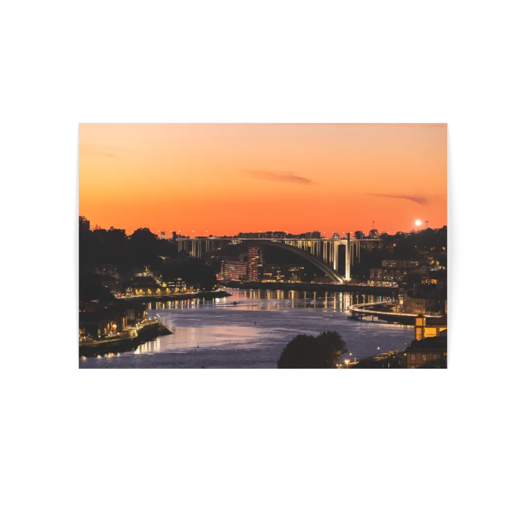 This landscape print captures the iconic bridge stretching across the river, silhouetted against the fading light, as the calm waters mirror the vibrant colors. Creating a harmonious blend between nature and architecture.