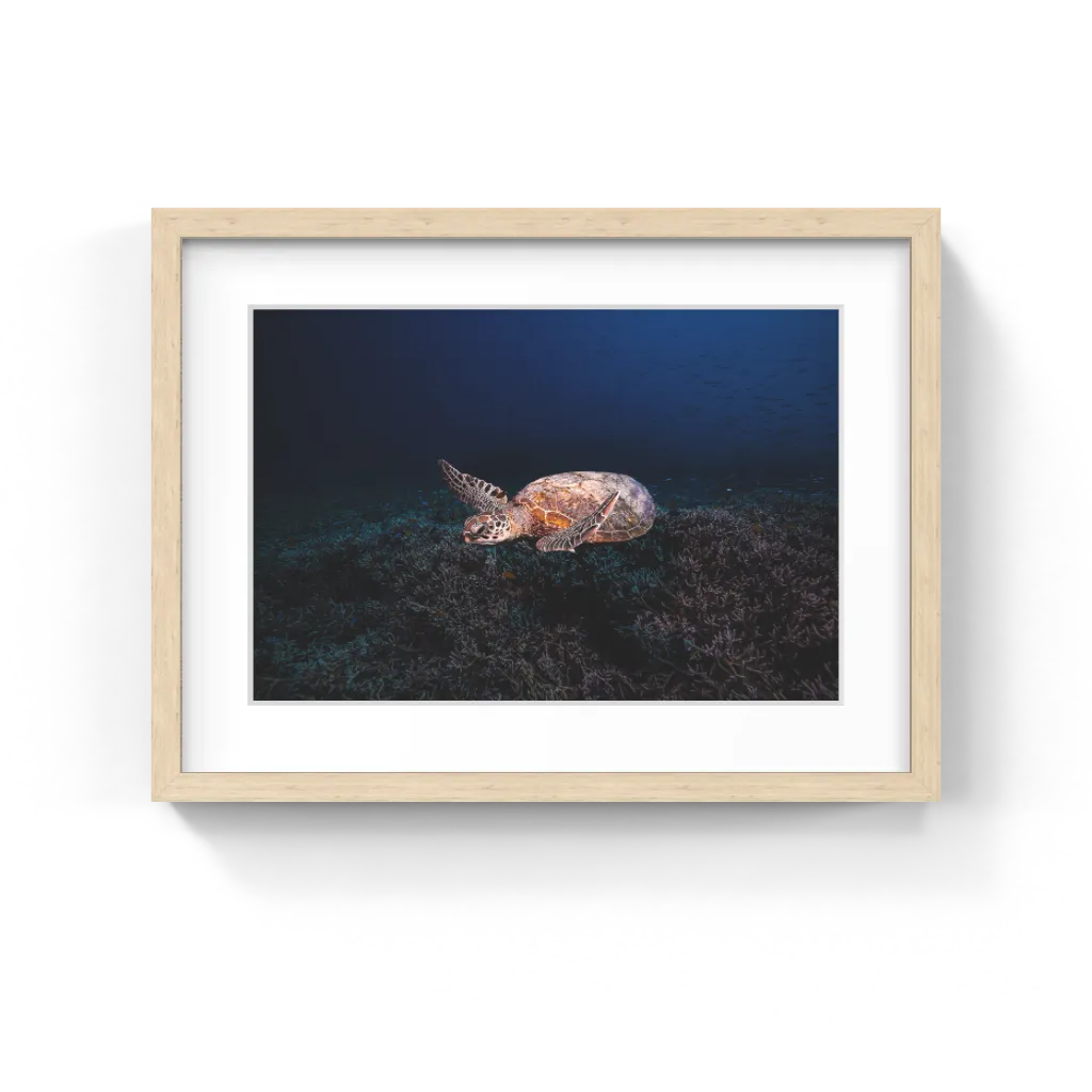 As the sun went down this beautiful green sea turtle cruised around us exploring the fields of coral and then wandered off into the deep blue night.