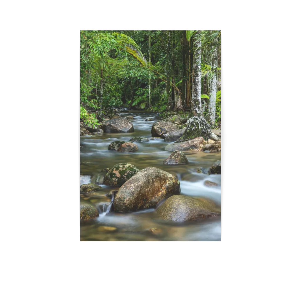 The gentle flow of water over the creek's boulders carves a path to the unknown, flanked by palm trees, forming a gateway to the lush jungle beyond.