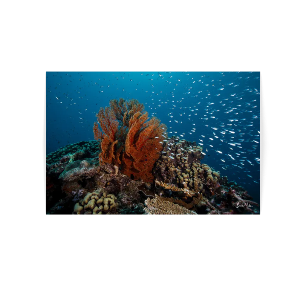 Captured at Heron Island, Fireplace centres around a striking fan coral glowing in burnt orange and flame-like tones, standing out beautifully against the deep blue of the surrounding reef.