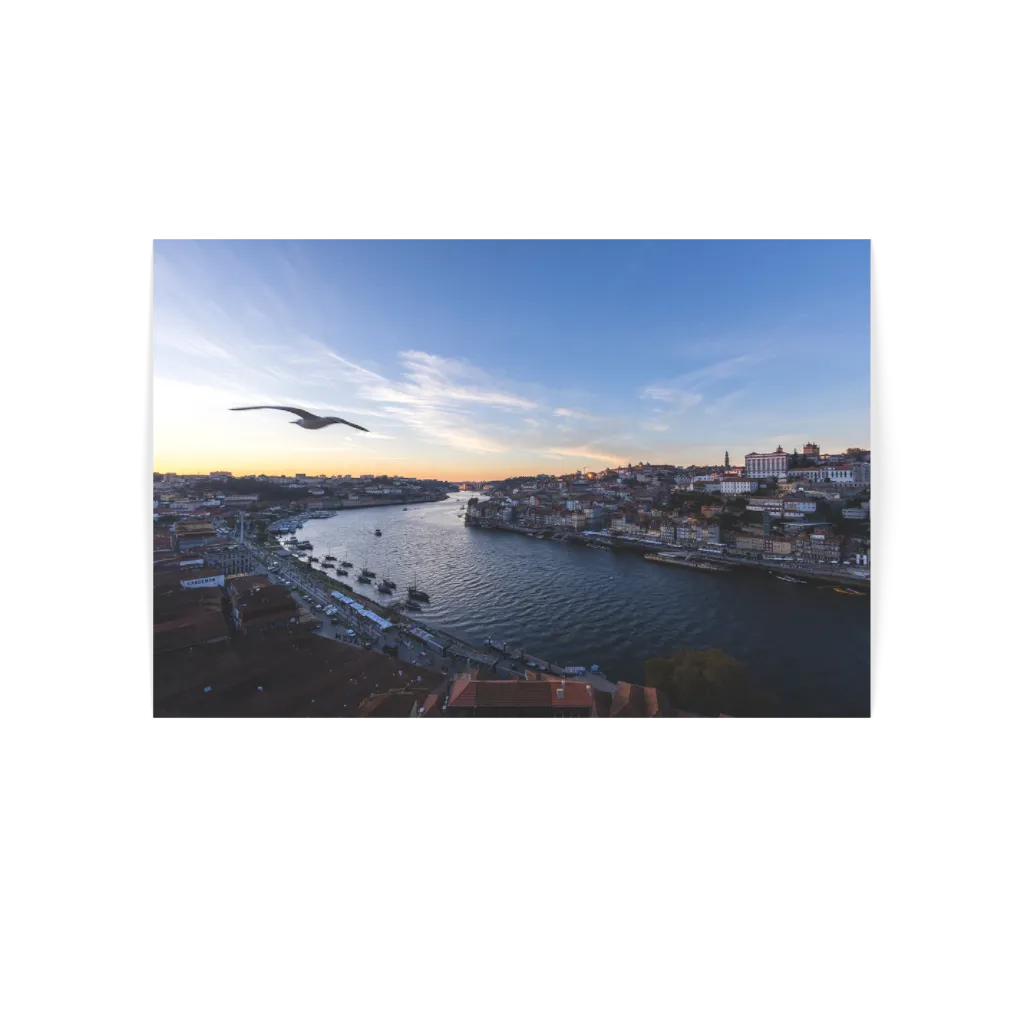This print captures the harmony of nature and architecture, with the seagull adding a touch of life to the tranquil beauty of sunset on the Douro River.