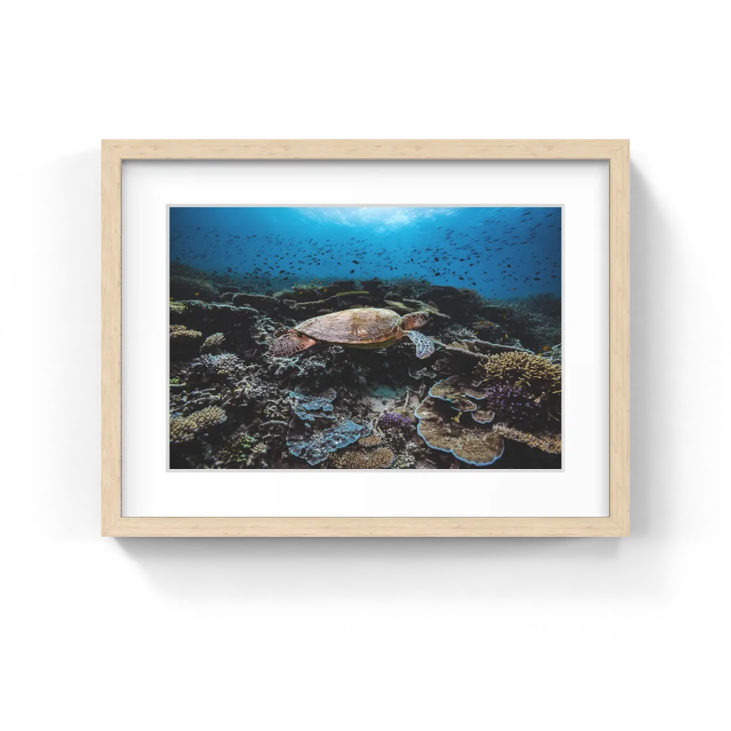 What a vibrant and healthy reef this green turtle has to call home - almost blending in to this stunning seascape backdrop.