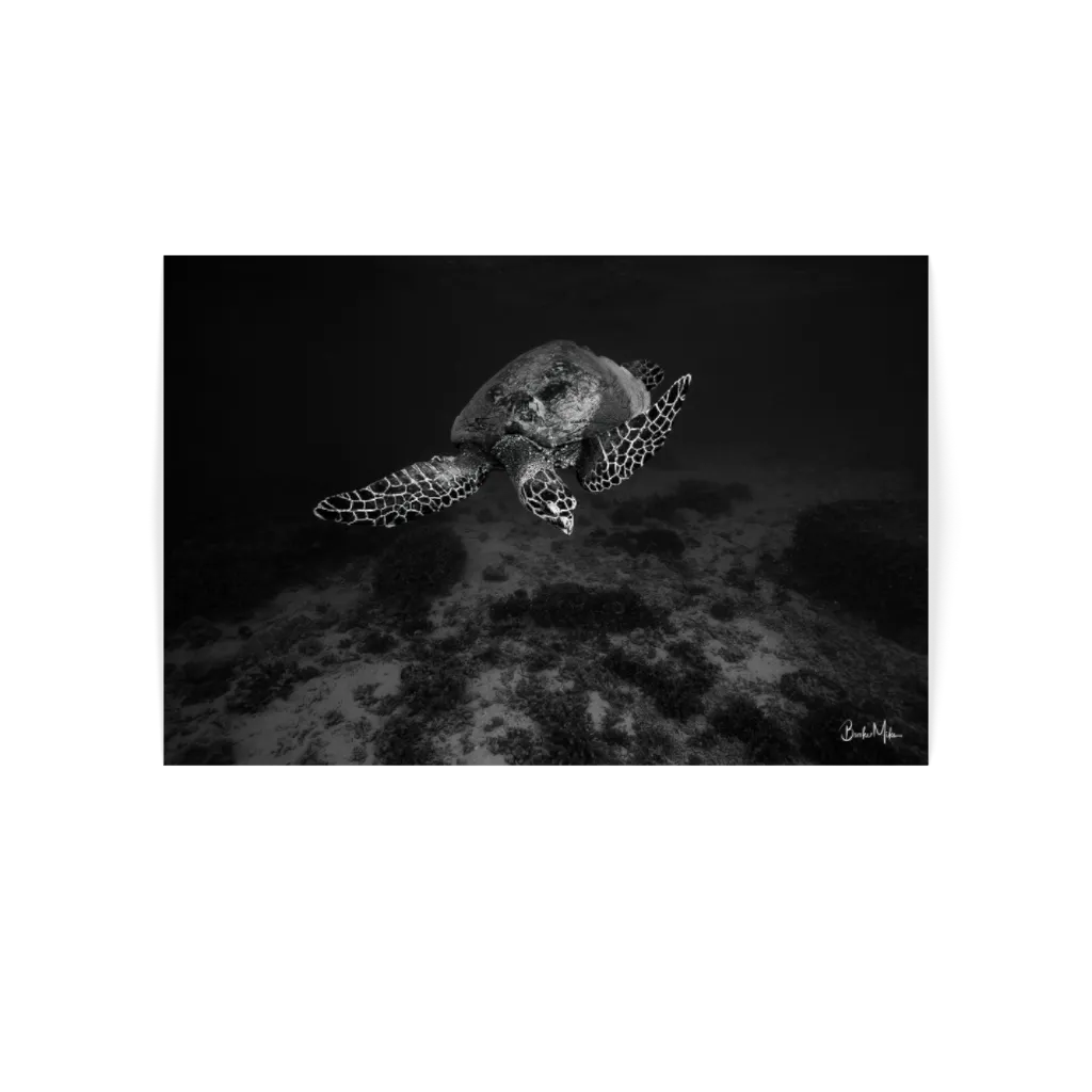 In this monochromatic frame, the patterns of his shell, flippers, and head take on an almost mosaic-like structure, with the natural scutes forming intricate lines and textures that feel abstract from this perspective.