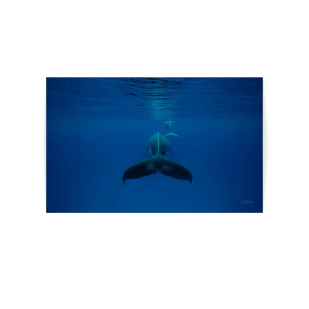 Captured in a tender moment, this print showcases a humpback whale mother and her calf swimming away from the camera, their graceful movements a symbol of calm and connection.