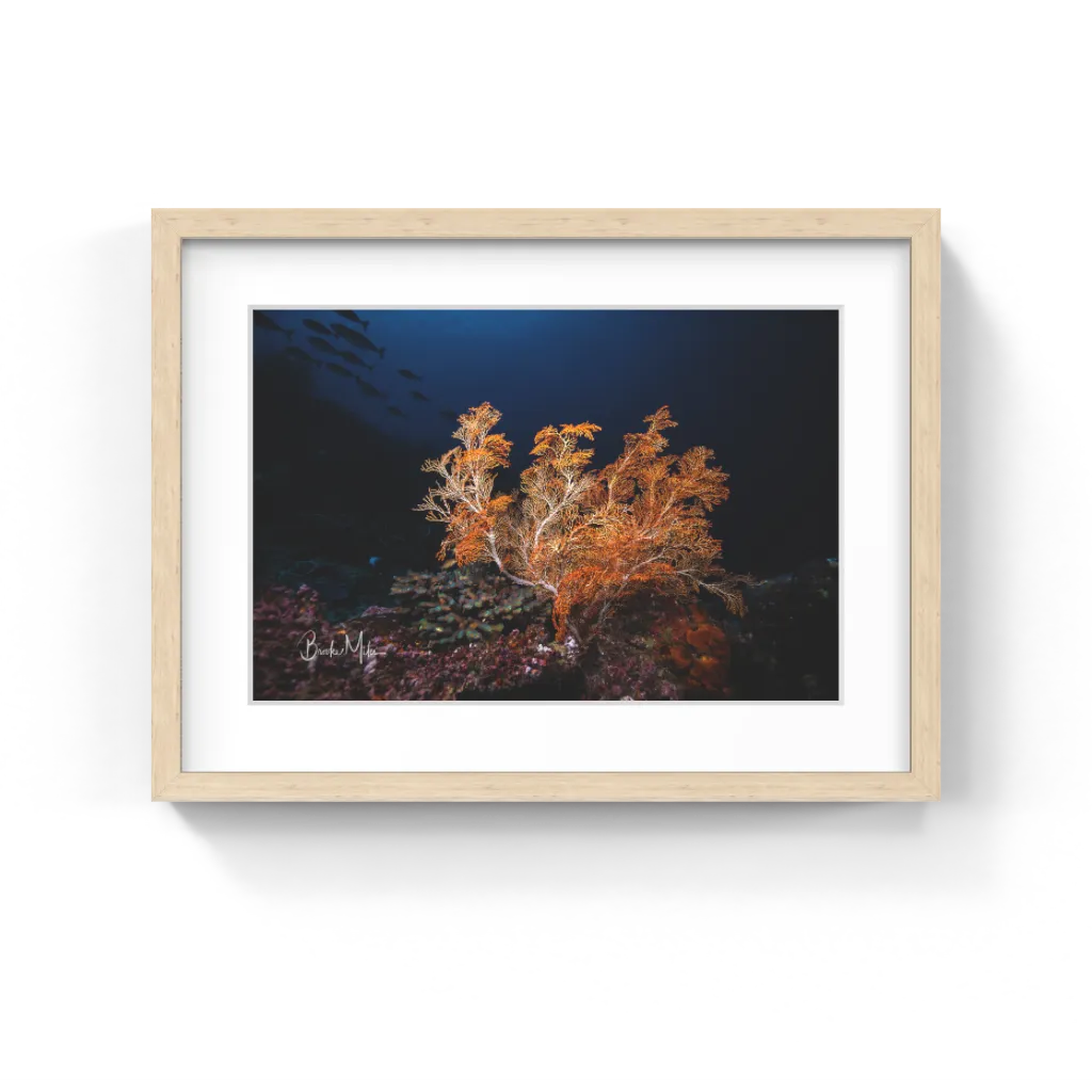 The coral sea fan in this image has the most striking orange colour, calmly poised in a reef bed, set against the deep blue and schooling fish. It makes a truly beautiful print.