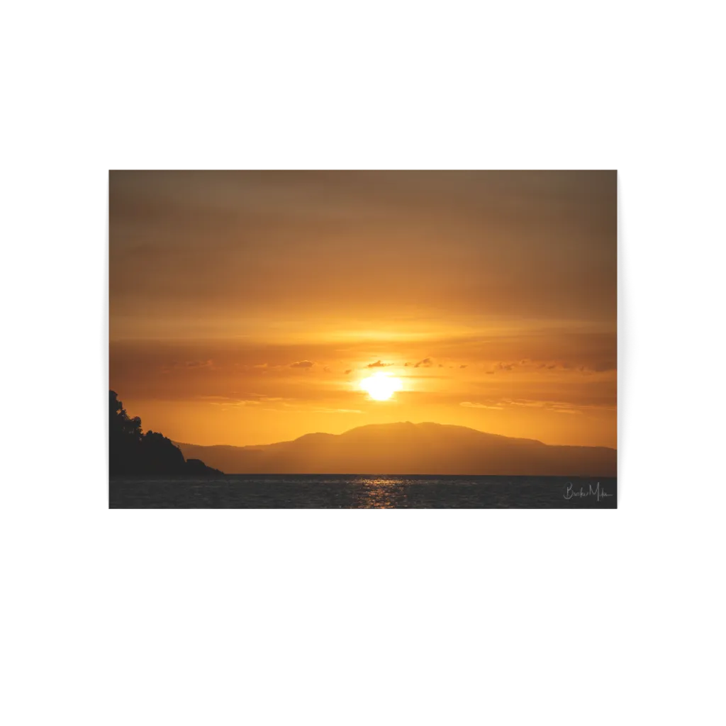 Casting its golden glow over the coastline to the west, the warm hues of the setting sun reflect on the water, creating a serene and timeless scene.