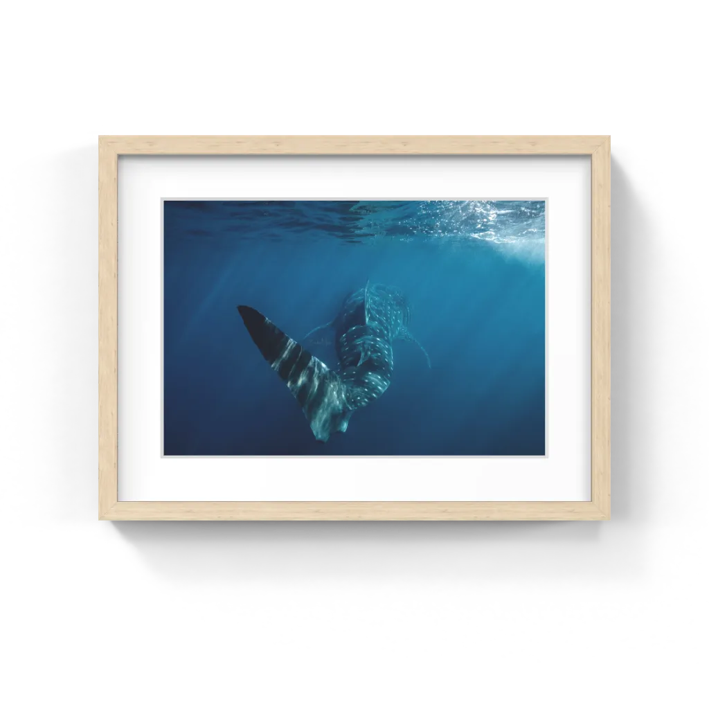 This print shows us how the whale shark glides past without a care for the presence of a human in its home, just below the surface of the East Indian Ocean.
