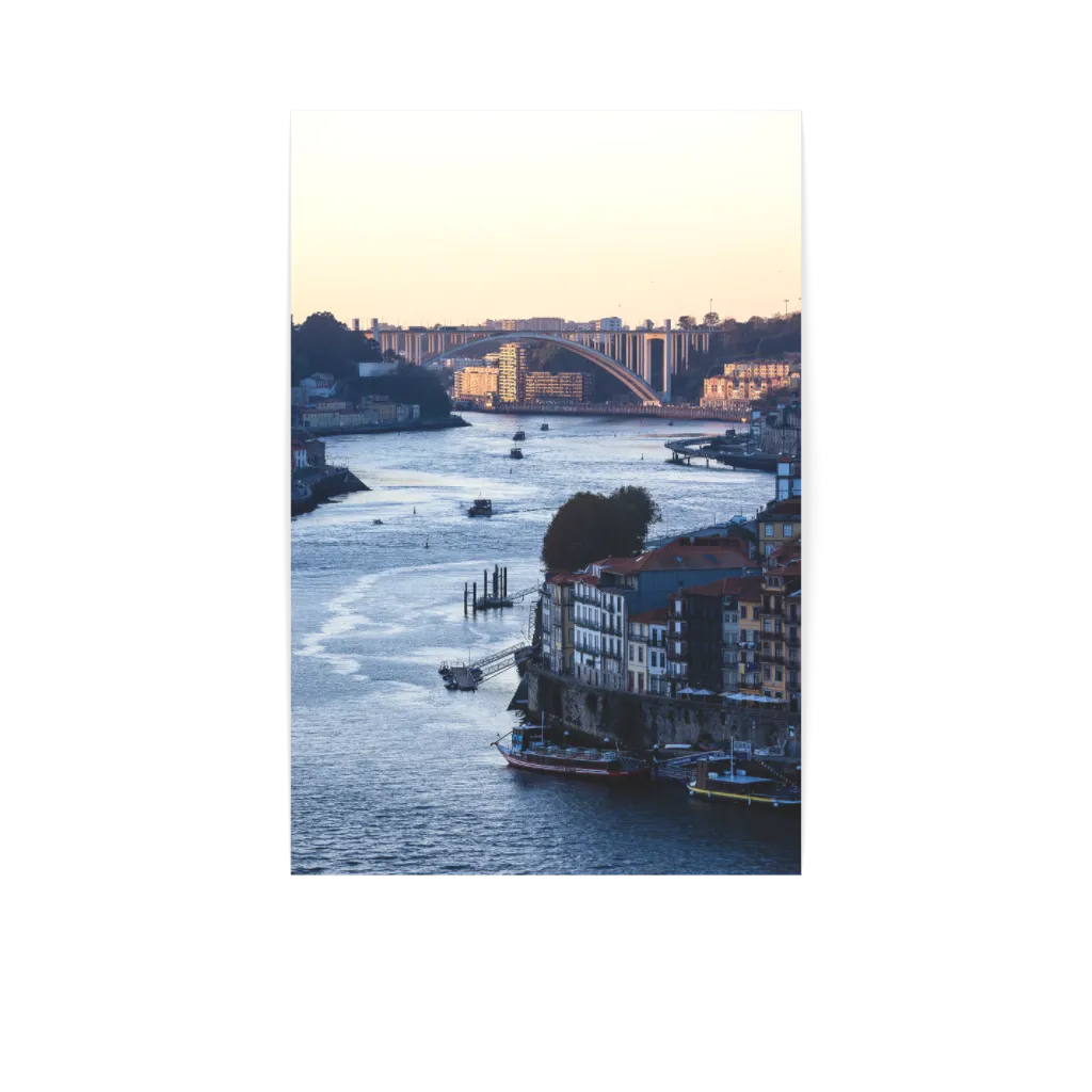 The last golden hues of sunset bathe the Douro River bridge in a warm, tranquil glow.