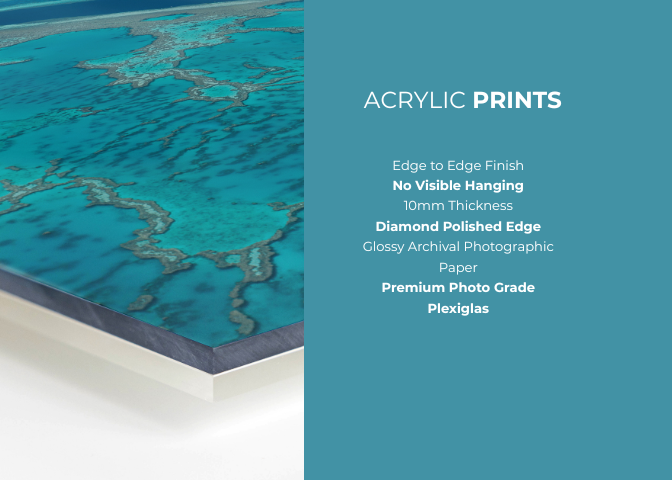 Glossy, gallery finish! Our acrylic prints feature ultra-vivid, gloss archival photographic paper, mounted between two 5mm sheets of clear acrylic.