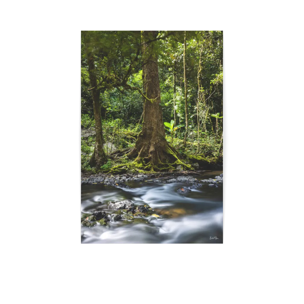 Along the river's edge, an aged tree trunk rests in the still water below a waterfall; a reminder of strength, change, and the slow rhythm of nature. Time Traces evokes the quiet passage of time, where every curve of bark and ripple in the water tells its own story. A beautiful, rainforest waterfall print.
